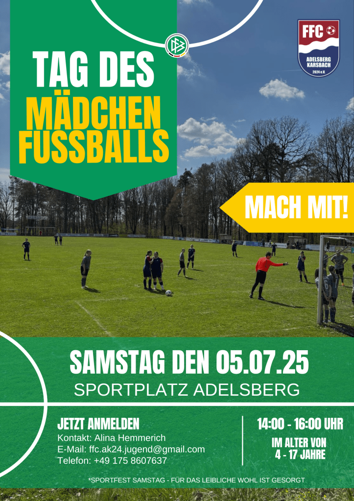 Dann schau am 05.07.2025 von 14:00 bis 16:00 Uhr auf unserem Sportgelände in Adelsberg vorbei!