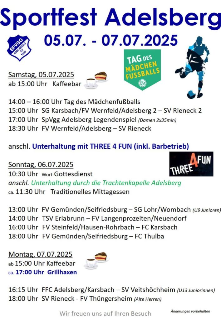 Vom 5. bis 7. Juli 2025 lädt die SpVgg Adelsberg zum großen Sportfest ein – mit spannenden Spielen, leckerem Essen und toller Unterhaltung für alle Altersgruppen.